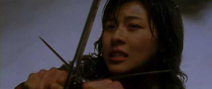 슬픈눈의 얼굴이 다가올수록 그녀의 표정은 밝아져 가고.... (첫번째 대결인 돌담길 격투장면의 반복이죠.)